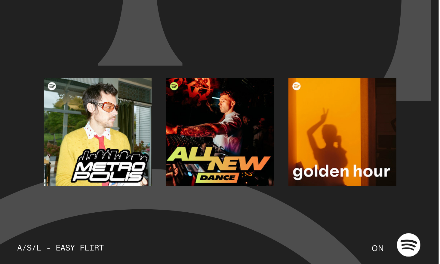 SPOTIFY includes A/S/L'S "EASY FLIRT" ON THEIR METROPOLIS, ALL NEW DANCE, GOLDEN HOUR, DISCOLAND & FRESH FINDS DANCE PLAYLISTS